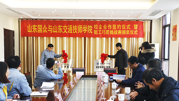2016年12月6日,山東國眾與山東交通技師學院校企合作暨山東交通技師學院第四屆技能節“能工巧匠”挑戰賽頒獎儀式在公司舉行。山東交通技師學院副院長任東等校方領導一行參加了本次校企合作揭牌儀式暨頒獎儀式,公司總經理謝文成、常務副總經理劉文吉、崔新平等公司領導及受獎員工部門長等參加了儀式活動。公司常務副總經理劉文吉主持儀式。